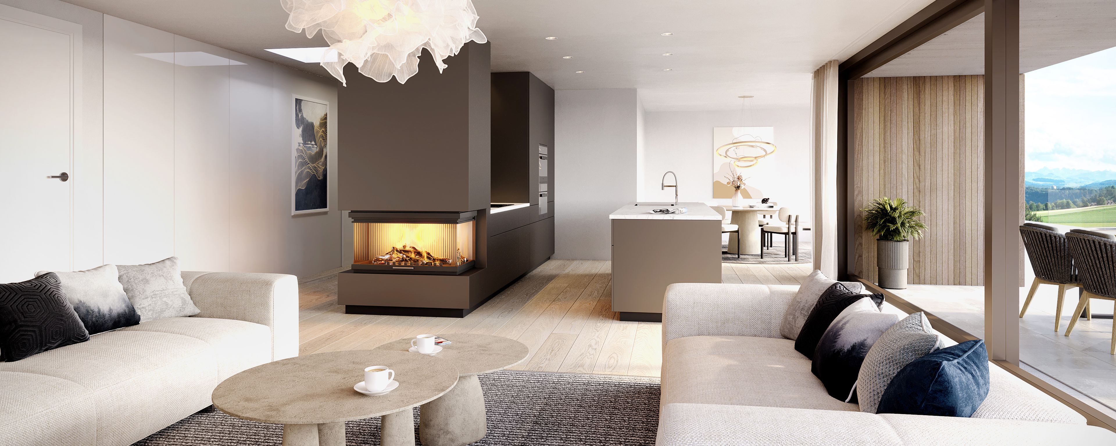 Die Fassade ist mit einer Holzschalung und Faserzementelementen verkleidet. Zusammen mit der hinterlüfteten Unterkonstruktion bildet dies ein langlebiges und zugleich elegantes System. Weiter zeichnet sich die Fassade mit grosszügigen Fenstern aus, welche die Räume mit Licht durchfluten. Die Aussenräume definieren sich durch privaten Garten, wohnlichen Loggien und grossflächiger Terrasse im Attika.